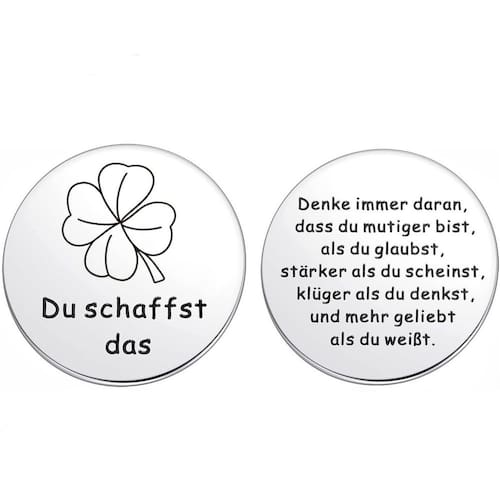 Material: aço de titânio Peso: 10 g Tamanho: 3 x 0. cm Embalagem: 1 x CoinGerman Motivational Design — apresenta “Du Schaffst Das” com um trevo de quatro folhas em um lado e uma citação alemã inspiradora no verso. Compacto e portátil — leve e fácil de transportar no bolso, carteira ou preso ao porta-chaves de couro incluído. Aço inoxidável durável — Feito de aço inoxidável premium com gravação precisa em frente e verso para detalhes duradouros. Amuleto da Sorte Significativo — Funciona como um lembrete constante de coragem, força e autoconfiança, ideal para o incentivo diário. Lembrança perfeita — Uma moeda comemorativa pequena, mas poderosa, projetada para levar positividade e motivação aonde quer que você vá.