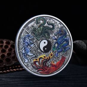 Material: ferro Peso: 35 g Tamanho: 4 x 0,3 cm Embalagem: 1 x CoinFour Chinese Mythical Creatures Design: apresenta um relevo 3D de quatro criaturas chinesas lendárias, incluindo dragão, tigre, fênix e tartaruga, simbolizando poder, proteção, boa sorte e longevidade. Símbolo Yin Yang: O centro da moeda apresenta o símbolo Yin Yang, representando equilíbrio e harmonia, adicionando uma dimensão filosófica e espiritual ao design. Acabamento antigo niquelado: Feita de ferro durável com acabamento niquelado de alta qualidade, esta moeda comemorativa possui uma aparência elegante com gravuras detalhadas e uma aparência antiga atemporal. Símbolo de Força e Harmonia: As criaturas míticas e o símbolo Yin Yang são representações tradicionais da cultura chinesa, incorporando força, paz e equilíbrio de forças opostas. Perfeita para colecionadores: ideal para quem aprecia a mitologia chinesa, símbolos culturais ou moedas colecionáveis exclusivas, esta peça oferece beleza artística e rico significado cultural.
