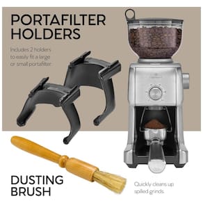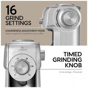 Moedor de café cônico ChefWave CW CG01SS com 16 configurações de moagem, capacidade para 2 a 10 xícaras, recipiente de grãos de 414 mL e recipiente de café moído de 147 mL. Possui temporizador, botão de moagem rápida e sistema de segurança.Desmontável