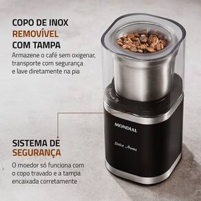 Prático e funcional, possui tampa com trava de segurança e acionamento por pressão, que permitem controlar facilmente o tipo de moagem, da mais fina à mais grossa, ideal para diferentes métodos de extração, como espresso ou coado.