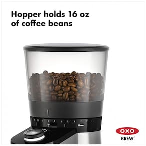 Moedor de café elétrico OXO com 38 configurações de moagem ajustáveis, lâminas cônicas de aço inoxidável, motor de baixo ruído, funil para 470mL de grãos e detector de grãos.