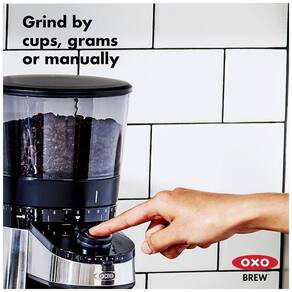OXO Brew Conical Burr Coffee Grinders built in scale measures grounds by weight instead of time, eliminating the need for a separate scale automatic shutoff ensures a precise amount of ground coffee every time. Lâminas cônicas de aço inoxidável duráveis de criam moagens uniformes para até 38 configurações de fino para café expresso a grosso para prensa francesa ou bebida fria. O motor de alto torque, baixa velocidade não superaquece os grãos, preservando o sabor e gerando estática mínima para menos bagunça. A detecção de superaquecimento integrada protege o motor para uma vida longa. Use o mostrador único para alternar entre o modo de copos, o modo de gramas ou o modo manual. No modo Xícaras, você moe com base no número de xícaras de café que deseja preparar. O detector de grãos não permite moer se a tremonha estiver vazia. O funil comporta 470mL de grãos de café e possui um alçapão para reter os grãos quando o funil é removido. O protetor de borras comporta até 125 gramas café moído suficiente para preparar 12 xícaras