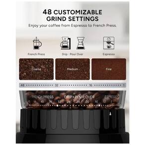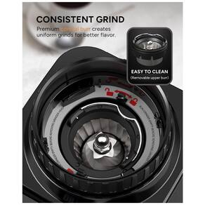 Rebarba cônica em aço inoxidável, tecnologia antiestática, 48 configurações de moagem, funil com sistema de travamento, controle de quantidade de moagem por xícaras ou tempo.
