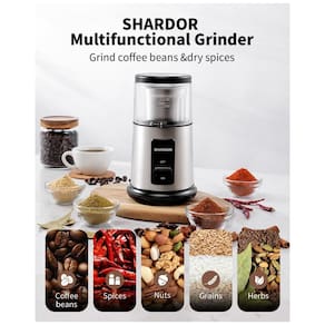 O moedor de café elétrico SHARDOR foi desenvolvido para moagem rápida e homogênea de grãos de café, especiarias, ervas secas, sementes e nozes em uso doméstico. Com acionamento por pressão no topo, o usuário controla o grau de moagem pelo tempo de funcionamento, permitindo obter desde granulometria mais grossa até pó fino para diferentes métodos de preparo.