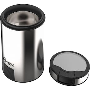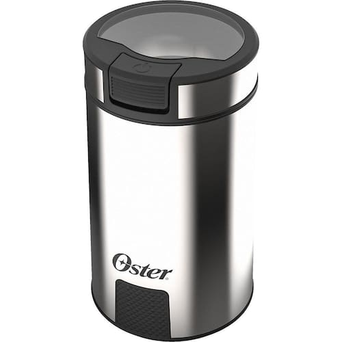 Moedor de café Oster Inox com potência de 150W, capacidade de 50 gramas, lâminas em aço inox e fio retrátil.Desmontável