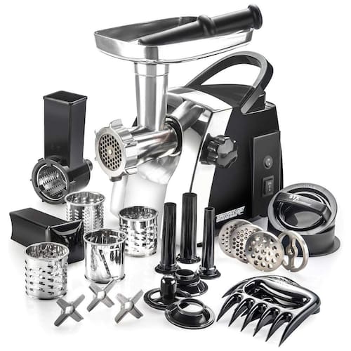 O kit completo do cadete Turboforce STX inclui Cabeça e bandeja de carne em alumínio polido 1 tamanho 8, 3 lâminas de corte Quad Beveled de aço inoxidável, 3 tamanhos de placas de moagem, 3 tamanhos de tubos de recheio de salsicha, 1 Kubbe , Kibbe Maker, 1 Stuffer de carne, 2 Meat Shredder Claws e uma Burger Slider Patty Maker Press. Inclui também 1 Vegetais completos, Queijo, etc. Acessório Fatiador , Triturador , Ralador com 4 Lâminas. 1 Corte, 2 Trituração e 1 Lâmina Raladora. Este Moedor de Carne Elétrico Cadete Turboforce apresenta uma potência de motor bloqueada de 1200 Watts com um poder de trituração normal de 550 Watts durante a moagem a sua carne. Este moedor é um moedor de tamanho 8, o que significa que as placas de moagem têm 2 7 , 16 de diâmetro. Os tamanhos dos orifícios nas placas de moagem são de , e , o que lhe dá uma boa escolha do tamanho da moagem que você deseja fazer para a sua carne. Este moedor também apresenta um Prato Beaner, que é especificamente para rechear salsicha. Este K completo também inclui um anexo de fatiador , triturador , ralador de vegetais que inclui 4 lâminas de aço inoxidável de tamanhos diferentes. Há uma lâmina de corte de , uma lâmina de corte de e e uma lâmina de ralar de . Este acessório funciona muito bem para fatiar, ralar ou ralar batatas, pepinos, abobrinhas, brócolis, rabanetes, brócolis, beterraba, cenoura, etc. Você pode até mesmo ralar ou ralar queijo, chocolate e nozes duros. POR FAVOR, LEIA ISTO NÃO moa Tendões Animais, Legumes, Plantas, Nozes ou Frutas com este moedor. Este é um moedor de carne doméstico de serviço médio e não se destina ao uso . Este moedor de CARNE NÃO GRINARÁ OSSOS Embora você possa ver comentários , análises de clientes indicando o contrário, os resultados não são consistentes e você provavelmente ficará insatisfeito com a compra deste produto