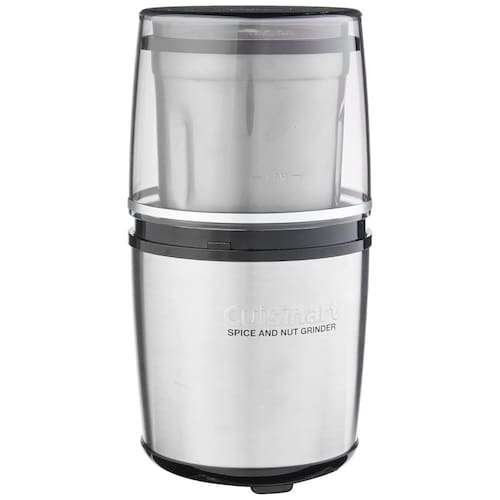 Moedor elétrico de especiarias e nozes Cuisinart com lâminas em aço inoxidável, tigela de 90 gramas e controle por push. Tampa e tigela laváveis na máquina de lavar louça. Possui intertravamento de segurança e pés antiderrapantes.Desmontável