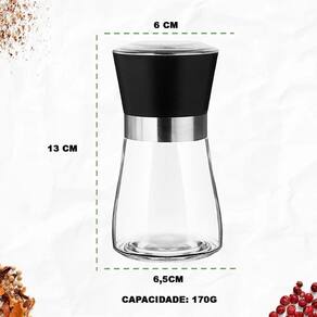 O Moedor de Pimentas e Sal é ideal para quem busca temperos fresquinhos e moídos na hora de forma prática e eficiente O Moedor de Especiarias é ideal para diversos tipos de tempero como Pimenta do Reino, Pimenta rosa, Sal Grosso Grãos entre outros Conta com design moderno e ergonômico, tornando o uso ainda mais confortável, além de ser confeccionado em vidro de alta espessura para garantir maior resistência, a tampa é confeccionada em aço inox e plástico. Sua engrenagem de moagem é fabricada em cerâmica de alta qualidade, que garante uma moagem perfeita e em duas espessuras diferentes: grosso e fino Com certeza é o item que falta para deixar sua cozinha ainda mais completa. Para aumentar a durabilidade do seu produto, recomendamos higienizar com esponja macia e não guardar em local úmido.