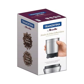 Moedor De Grãos Tramontina By Breville Coffee & Spice Em Aço Inox Fosco 220 V Tramontina Moedor de grãos Tramontina by Breville Coffee & Spice em Aço Inox Fosco 220 V Tramontina - Nada como um cheirinho de café em qualquer hora do dia. Com o Moedor de grãos Tramontina Coffee & Spice em Aço Inox Fosco 220 V da Linha Eletroportáteis você vai moer grãos com a qualidade que só a Tramontina pode oferecer. O recipiente interno de aço inoxidável é fácil de remover e limpar. O sofisticado sistema de lâminas são de aço inoxidável que trituram os grãos com precisão. Possui tampa transparente que facilita a visualização do processo de trituração. O botão de liga e desliga é acionado pelo toque, pressionando a tampa transparente até o tempo necessário para trituração. Possui 220 V de voltagem.Recipiente interno de aço inoxidável, de fácil remoção e limpeza. Sistema de lâminas de aço inoxidável. Tampa transparente, podendo ser observado o processo de trituração. LIGA/DESLIGA: ativação por toque, pressionando a tampa transparente até o tempo necessário para trituração. Tensão: 220V Frequência: 60 Hz Potência: 200WObservaçõesAntes de usar, leia cuidadosamente todas as instruções do manual e guarde-o para consultas futuras. Antes de usar o Moedor pela primeira vez, remova e descarte com segurança todos os materiais da embalagem e etiquetas promocionais. Não coloque o Moedor da Tramontina perto das bordas do balcão ou da mesa durante a sua utilização. Assegure-se de que a superfície esteja nivelada, limpa e seca. Para evitar choques elétricos, não mergulhe a base do moedor, o cabo e o plugue de alimentação em água, nem permita que essas peças entrem em contato com umidade. Não use o aparelho continuamente por mais de 60 segundos, pois isso pode causar superaquecimento. Deixe-o esfriar por 10-15 minutos após funcionar por períodos longos. Não encha demais o recipiente. Cuidado ao limpar o recipiente de trituração, pois as lâminas são afiadas. Não use o aparelho para nenhuma outra finalidade além de moer grãos. O aparelho não mói alimentos úmidos ou extremamente duros, nem produz pastas de frutas, sementes ou ervas, como curry ou creme de amendoim. Este aparelho não deve ser utilizado por crianças. Mantenha o aparelho e o cabo fora do seu alcance.Características GeraisEAN137891116125090DUN1417891116125097NCM8509.40.90Peso Líquido0,9750 kg.Peso Bruto1,2310 kg.Metragem0,002799 m.Dimensões Embalagem (Compr. X Larg. X Alt.)201x 118x 118 mm.Dimensões Produto (Compr. X Larg. X Alt.)117x 117x 205 mm. Características Gerais do Produto: Garantia: - 1 Ano