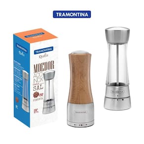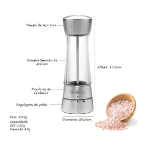 Com design clean, moderno e arrojado, os moedores de sal ou pimenta tramontina com base inox e com moinho em cerâmica leva beleza e praticidade para o seu dia a dia durante as refeições. Ideal para moer pimenta do reino branca ou preta, pimenta rosa, pimenta jamaica, pimenta síria, pimenta calabresa seca, sal entre outros. Uso doméstico ou profissional. Desenvolvido em aço inox e acrílico e o outro de bambu, o utensílio possui engrenagens de alta resistência proporcionando maior durabilidade. A facilidade de moer o tempero na hora, diretamente em seu prato, na medida desejada é uma das características do produto. Qualidade e eficiência é com a tramontina