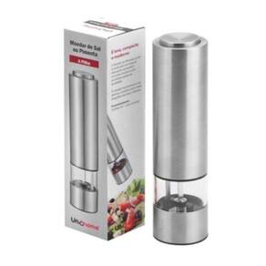 O moedor de pimenta ou sal é produzido em material altamente resistente à corrosão, durável e com excelente padrão de qualidade. O moedor elétrico combina com a mesa elegante e de sabor refinado. Características: Produto de alta qualidade Aço inoxidável revestimento exterior. Indicado para moagem de pimenta, semente de mostarda e outras especiarias de pequeno porte. com parafuso na parte inferior para ajustar a grossura da especiaria. Dimensões: 22,5 cm x 5,2 cm x 5,2 funciona com 4 pilhas AA não inclusa Instruções de uso: 1-Basta remover a capa em aço inox na parte superior do moedor e cuidadosamente retirar o copo plastico 2-Preencha, com as especiarias de sua escolha, a área de visualização transparente e remonte a tampa superior 3-Pressione o botão de cima para faze-lo funcionar. Ean: 7899670804284