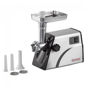 O moedor elétrico de carne Galaxy #5 é um equipamento compacto projetado para moagem de carne em cozinhas comerciais de uso leve. Possui motor de 400 W que processa até 0,9 kg por minuto, com operação reversível para desobstrução e 3 placas de aço inoxidável de 3,2 mm, 4,8 mm e 6,4 mm para moagens fina, média e grossa. Inclui 3 tubos para embutir linguiças e empurrador plástico para segurança.