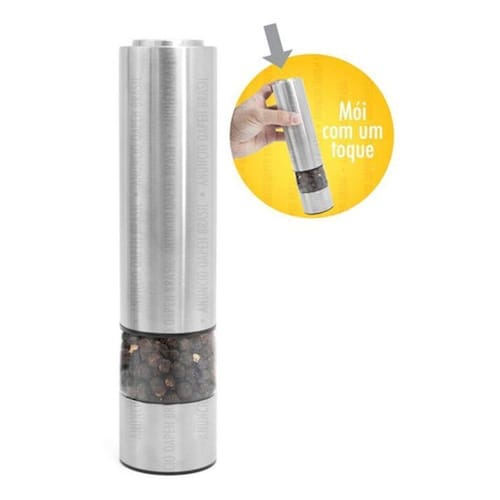 O moedor elétrico é indicado para a moagem de especiarias de pequeno porte, como sal grosso, pimentas, semente de mostarda etc. Prático de usar e com design elegante, combina perfeitamente com sua cozinha ou na mesa de jantar. Para iniciar a moagem, basta apertar o botão na parte superior do moedor. Possui ajuste de moagem e funciona com 4 pilhas aa. Além disso, ao apertar o botão, a luz no interior do moedor acende, facilitando identificar o local onde o tempero está caindo. Seu corpo é em aço inoxidável, durável e excelente padrão de qualidade. Cozinhe como um grande chefe e dê um up em suas receitas Informações sobre o produto: - dimensões: 22,5cm x 5,2cm - material: aço inoxidável inox - moinho em cerâmica - luz led na parte inferior - botão grande para ativação - diâmetro: 5cm - necessita 4 pilhas aa Obs.: o produto não acompanha o sal nem a pimenta. As imagens são ilustrativas.