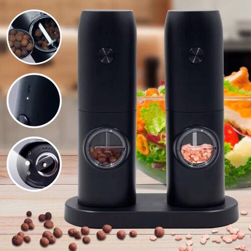 Kit com 2 moedores elétricos a pilha. Ideal para moer grãos, temperos, sal e pimenta. Capacidade de até 100g. Possui luz para auxiliar na moagem em ambientes com pouca iluminação.Base recarregável