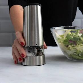 Moedor elétrico duplo para sal e pimenta com corpo em aço inoxidável escovado, mecanismo de moagem em cerâmica e câmaras transparentes em acrílico. Operação automática com o toque de um botão.Base recarregável