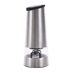 Moedor elétrico duplo para sal e pimenta com corpo em aço inoxidável escovado e câmaras em acrílico transparente. Possui mecanismo de moagem em cerâmica de alta durabilidade e operação automática com o toque de um botão.Desmontável