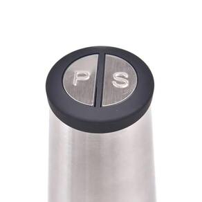 Moedor elétrico duplo para sal e pimenta com corpo em aço inoxidável escovado e câmaras em acrílico transparente. Possui mecanismo de moagem em cerâmica de alta durabilidade e operação automática com o toque de um botão.Desmontável