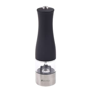Moedor elétrico de sal e pimenta Maxwell & Williams Cosmopolitan com mecanismo de moagem em cerâmica, capacidade de 70ml e corpo em aço inox. Acionado por pilha.