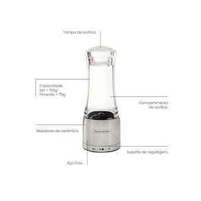 Com este Moedor Tramontina Sal ou Pimenta em Acrílico e Aço Inox com Moinho em Cerâmica, ficou muito mais prático temperar seus alimentos. Com design elegante, possui engrenagens de alta resistência e durabilidade. Tem regularem do tamanho do grão para você usar na medida certa.