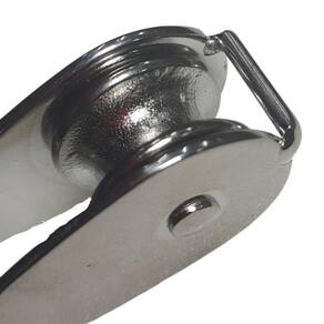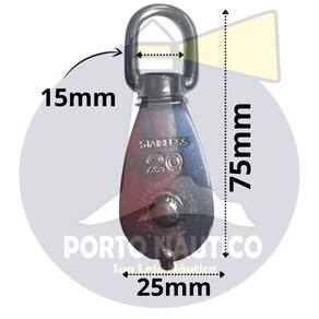 INFORMAÇÕES ADICIONAIS: Material: Aço inox 316. Tamanho: N20. Carga máxima: 75 kg. Contém alça destorcedor. Alta resistência e durabilidade. Projetado para pendurar objetos de peso para aliviar cargas Aplicação: Amplamente utilizado no esforço de tração de cabos de aço ou outras ferramentas de cabos. Uma corda, cabo, correia ou corrente geralmente passa sobre a roda e dentro da ranhura, se houver