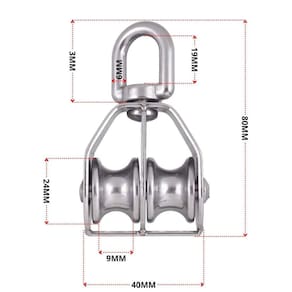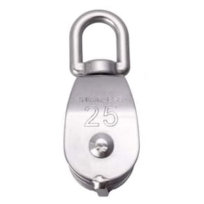 Infomações adicionais Nosso código: 5162 Material: aço inoxidável 304 Durável, forte, confiável, á prova d'água, antiferrugem, anti-alta temperatura, resistência á corrosão. Rolamento de carga: 150kg, adequado para corda de 9 mm Diâmetro do corredor: 25 mm, para informações detalhadas de tamanho, consulte as imagens Projetado para pendurar coisas pesadas para aliviar a carga. Para uso com corda em aplicações internas e externas Com anel de olho giratório pendurado na parte superior.