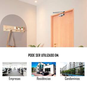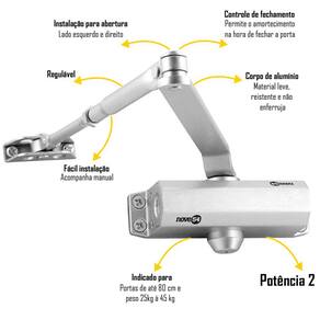- Mola / Amortecedor indicada para fechamento automático de portas de madeira, portas de alumínio e portões de até 80 cm, com massa de 25 kg a 45 kg;