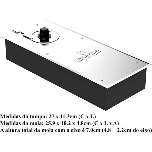 Verifique as medidas do produto nas imagens do anúncio e confirme se as medidas do mesmo são compatíveis com o local onde a mola será instalada e com a porta que será instalada. Certifique-se que a mola esteja alinhada com o chão no momento da instalação. O produto deve ser instalado por um . Medidas da tampa: 27 x 11.3cm C x L . Medidas da mola: 25.9 x 10.2 x 4.8cm C x L x A . A altura total da mola com o eixo é 7.0cm 4.8 + 2.2cm do eixo . Especificações Técnicas: - Indicado para aplicações residenciais ou comerciais. - Funcionamento misto mecânico/hidráulico. - Trava mecânica em 90º mantém porta aberta se necessário. - Uma única válvula para ajuste da velocidade de fechamento entre 0º a 110º. - Regulagem única de velocidade 1 estágio . - Portas até 100kg com largura de 1m e altura de 2.1m medidas aproximadas . - Fechamento suave da porta evitando que a mesma bata. - Eixo fixo Santa Marina SM para portas de vidro: portas de abrir pivotantes . - Abre para ambos os lados: pode ser invertida para se ajudar ao lado de abertura da porta. - Acabamento em inox: maior durabilidade e vida útil do produto. - Medidas da mola: imagem no anúncio - verifique as medidas com atenção antes de realizar sua compra. - Peso aproximado: 3.4kg. - 12 meses: 1º mês vendedor + 11 meses Soprano. - Cor: prata blindex. - Modelo: P310. - Marca: Soprano. Conteúdo da embalagem: - 1x Mola parte mecânica Soprano P310. - 1x Espelho de acabamento inox. - 1x Kit de instalação. - 1x Gabarito. - 1x Manual de instruções. Descrição Detalhada: Mola Soprano P310 para instalação em portas de vidro. Com um funcionamento misto mecânico/hidráulico para uma abertura e fechamento mais suave. Possui trava mecânica em 90º porta aberta com única válvula para ajuste da velocidade de fechamento entre 0º a 110º. Suporta portas até 100kg potência fixa 2 com largura de 1m e altura de 2.1m medidas aproximadas . Eixo fixo Santa Marina SM e abre para ambos os lados. Acabamento de alta qualidade em inox. Não acompanha outros acessórios além dos elencados acima. Imagens meramente ilustrativas. Marca: Não Informado