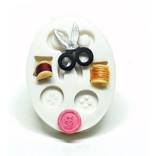 Medida da peça pronta: Tesoura: 3x2,5cm; Botões: 1,4cm; Carretel: 1,3x1,1cm.