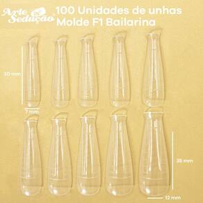Também conhecido como Express e Invertido, o Molde F1 é utilizado como molde na criação de alongamentos de unhas como unhas de gel, acrílico e porcelana. Reduz o tempo do processo de aplicação, economiza material e diminui a necessidade de acabamento. É utilizada a técnica Dual Form, onde o molde é preenchido com material acrílico e aplicado na unha, sendo retirado após a secagem. Inclui linda caixinha acrílica contendo 100 unidades do Molde F1 modelo Bailarina com 10 tamanhos diferentes para melhor adaptação, sendo 10 unidades de cada tamanho.