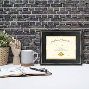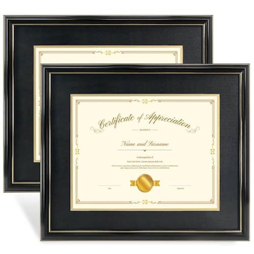 - Tamanho: Feito para exibir documentos de 28 x 35 cm com tapete duplo preto sobre ouro e diplomas de 38 x 45 cm sem tapete. Molde de 3,18 cm de largura e 2,5 cm de espessura. O tamanho total é de 41 x 48 x 2,5 cm.
