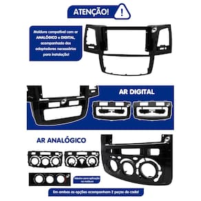 ESPECIFICAÇÕES TÉCNICAS: - Pode ser utilizada em multimídias de 9" padrão Chinês; - Compatível com o ar condicionado Digital e Analógico; - Acompanha adesivo para aplicação na moldura (para o ar digital); - Acabamento impecável na cor BLACK PIANO (Preto Brilhante); - Encaixe perfeito e de fácil instalação/utilização; - Longa durabilidade; - Excelente acabamento.