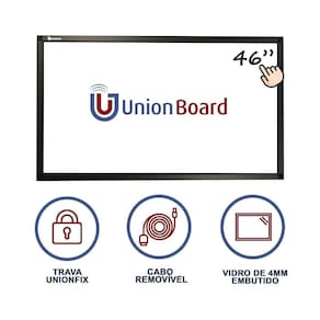 Moldura/Lousa/Tela Touchscreen Unionboard 46 A moldura interativa Unionboard 46 é a solução perfeita para transformar sua TV convencional em touchscreen. Com ela, você poderá desfrutar de uma experiência interativa e intuitiva em sua própria casa ou escritório. A instalação da moldura é simples e fácil. Basta fixá-la na televisão, conectar o cabo USB da moldura ao computador para habilitar o toque e conectar o cabo de imagem HDMI ou VGA do computador à televisão. Pronto, sua TV agora é touchscreen! A moldura interativa Unionboard é compatível com diversos sistemas operacionais, como Windows, Linux, , Android, Chromebook e . Além disso, ela acompanha o software Unionboard Pro, o software de interação de conteúdo mais completo do mercado. Com um vidro embutido de 4mm, a moldura Unionboard oferece um toque mais preciso, estável e protege a tela da sua televisão. Ela possui até 10 toques simultâneos, permitindo uma interação ainda mais dinâmica. Os diferenciais da moldura Unionboard incluem de 5 anos, acabamento em preto fosco discreto e elegante, design exclusivo que não deixa o vidro aparente na lateral do frame e funcionamento normal com usuários que utilizam luvas ou algum tipo de proteção nas mãos. O kit da moldura interativa Unionboard inclui: 01x moldura interativa Unionboard, 01x cabo USB/JST, 02x canetas plásticas, 01x software de utilização Unionboard Pro , 01x kit de travas de fixação Unionfix e 01x manual de utilização/instalação. Marca: Não Informado