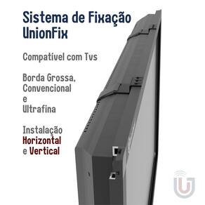 Possui sistema de fixação unionfix : são travas de segurança para fixação em tvs com borda normal e ultrafina por meio de fixadores com ajuste de tensionamento. Proporciona maior segurança na fixação a tv , que é feita em conjunto a fita dupla face + sistema unionfix