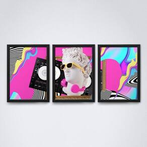 3 Quadros Decorativos Cor Rosa Moldura Preta