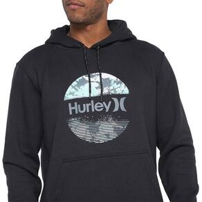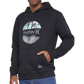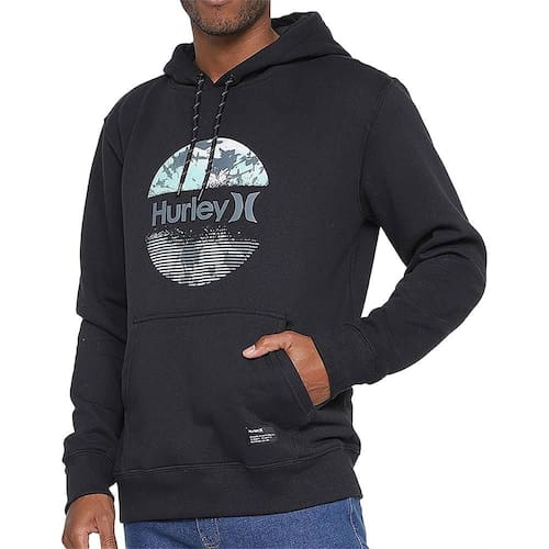 Moletom Hurley com bolso canguru, capuz com cordão ajustável, estampa frontal e etiquetas personalizadas.