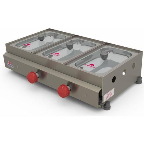 - Estrutura em aço inoxidável; - 3 cubas; 5cm A x 26cm L x 16cm P cada . - 2 Queimadores posicionado abaixo de duas cubas, NÃO tem banho Maria. - Tampos de vidro - Utilização com botijão. - Pezinho borracha. - Gaveta PR-03 G completa - Trabalha á gás GLP baixa pressão . - Consumo médio: 0,200 Kg/h - Peso Líquido: 7,4 Kg - Peso Bruto: 8,5 Kg - Medidas internas cada cuba: 5cm A x 26cm L x 16cm P - Medidas externas: 16cm A x 59cm L x 35cm P - Medidas embalagem: 18cm A x 61cm L x 38cm P Marca: Não Informado