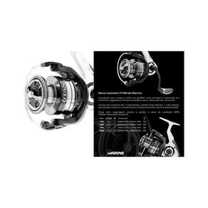 fabricante: marine modelo:titan 4000 relação de recolhimento: 5. 2:1 ipt: 82cm 7 rolamentos sistema balanceado cursor de linha carretel em aluminio material do corpo: grafite rotor em grafite freio selado resistente a agua manivela com infinito anti reverso manivela removível utilizada no lado direito ou esquerdo capacidade de linha: 0. 37mm - 150m / 0. 40mm - 120m peso aproximado: 295 gramas drag: 10kg