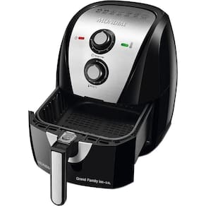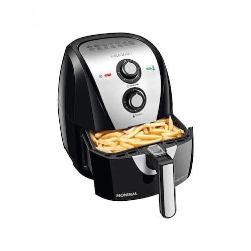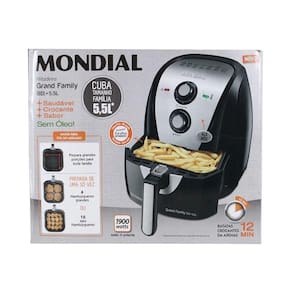 Tecnologia de circulação de ar quente que cozinha, frita a ar, assa e tosta os alimentos sem necessidade de adicionar óleo. Cesto com capacidade de 5,5 litros.Porta-fio