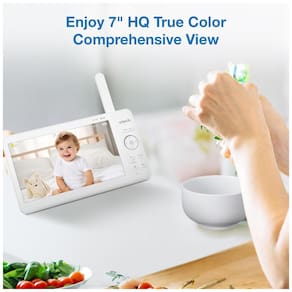 Além disso, o monitor de vídeo para bebês VTech Advanced HQ Max 7 oferece sons suaves e sensor de temperatura. 5 melodias calmantes e 5 sons ambientes suaves, incluindo um riacho e ruído branco, criam um ambiente reconfortante para acalmar o bebê. O sensor de temperatura com indicador ajuda os pais a saberem o nível de conforto do berçário.