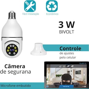 A câmera lâmpada wi-fi ip de segurança é a solução ideal para monitorar a sua casa ou empresa. Com instalação fácil e rápida, basta conectá-la em um bocal de lâmpada comum. Oferece visão em tempo real, controle de movimentação e zoom pelo celular, além de luz e áudio bidirecional. Possui alta resolução full hd 1080p e detector de movimento que envia notificações diretamente para o seu celular.