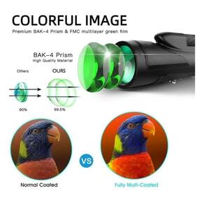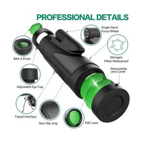Monocular monocular 12x50 de alta potência e alta potência com ampliação total de 12x e lente de objeto monocular de 50 mm de diâmetro, fornece uma imagem super nítida e brilhante. Aproveite a melhor vista em suas aventuras de observação de pássaros ao ar livre, caçar, caminhar, acampar, viajar, paisagens da vida selvagem, shows, esportes. Imagens de alto contraste e resolução, graças à mais recente tecnologia óptica, zoom monocular, visão noturna com zoom estelar equipado com prisma BAK-4 e f. lente mc que garante transmissão de luz e brilho superiores. A alta transmitância de luz atinge até 99,5%. E a visão noturna com pouca luz dos monóculos de visão ampla pode ajudar sua visão com pouca luz, proporcionando uma incrível experiência de visualização. - A abordagem com uma mão, o design compacto, o design ergonômico à prova d'água e o minidesign (5,9x2,1x1,7) ajudam você a se concentrar em seu alvo com rapidez e precisão com uma mão e explodir facilmente em qualquer bolso. A armadura de borracha durável com listras o torna confortável de usar com alça antiderrapante. Água impermeável cheia de nitrogênio com revestimento resistente a névoas e anel óptico selado evita umidade, poeira e sujeira, mantendo-a sempre limpa. Tipo de reservatório: monoculoAmpliação do telescópio: 12x Tipo de prisma: BAK4Sistema de foco: OculeFocusCampo de visão: 211 pés/1000 jardas\ nDiâmetro da lente ocular: 15 mm\ nDiâmetro do alvo: 50 mm\ nTamanho monocular: aprox. 155 x 55 mm\ nO pacote inclui:\ n1 * Monocular1 * Estojo de armazenamento\ n1 * Tecido de gafas\ n1 * Manual
