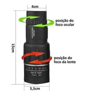 Monóculo Luneta Observação Aves e Animais 16x52 com Capa O Monóculo compacto é um produto para quem procura qualidade e ótimo alcance em suas observações. Este monóculo é indicado para uso em corridas, velejamento, teatro, caça, observação de pássaros e qualquer tipo de observação. Vem com o corpo emborrachado, dando mais firmeza para segurar, além de bolsa que facilita o transporte e manuseio. Características: Produto completamente revestido em borracha com texturas anti deslize, tornando o resistente a água e a quedas Monóculo com 2 Lentes ópticas feitas BAK4 Prisma, que transmite imagens claras, vividas e sem diferença nas cores. Informações Técnicas: - Campo de visão m : 66m/8000m. - Foco ocular: ajustável;-. - Foco da lente: ajustável. - Duplo sistema de foco. - Material das lentes: BAK4 Prisma. - Day & Night: Pode ser de dia e de noite. - Ângulo de Visão: 22 - Diâmetro aproximado da Lente Principal: 4cm; - Diâmetro aproximado da Lente Traseira: 2cm; - Medidas aproximadas do produto: 15cm x 5cm x 5,5cm; - Peso aproximado do produto: 267g; - Possui alça de segurança; Pacote Inclui: 01 Case para armazenamento. 01 Monóculo . 01 Lenço para limpeza. 01 Manual de Instruções. Marca: Não Informado Ean: 7893795118189