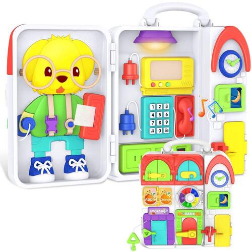 Brinquedos Montessori Busy Board para crianças pequenas com música bilíngue, mais de 20 atividades, brinquedo educativo Sensory Board para meninos e meninas de 2 a 4 anos, presentes de aprendizado de habilidades motoras finas para viagens infantis