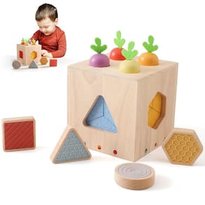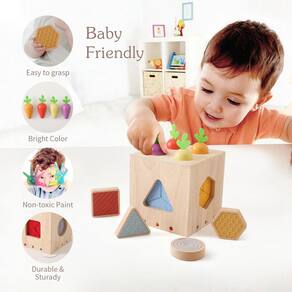 Este brinquedo MULTI Montessori inclui 1 cubo de classificação de formas, 4 blocos sensoriais de formas e cores diferentes e 4 cenouras de madeira, com uma função de armazenamento, todos os blocos e cenouras podem ser colocados no cubo para facilitar o armazenamento. Eles são todos feitos de madeira de qualidade l com tinta não tóxica à base de água, segura para crianças e ecológica. Os brinquedos de separação em forma de madeira são bem polidos e lisos, amigáveis à pele do bebê.
