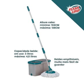 Características do o mop giratório duas águas flash limp mop7504 Material: cabo de aço inox, pp e abs. Refil de 100% microfibra. Dimensões: 15 cm de comprimento x 40 cm de largura x 20 cm de altura. Contém: 02 baldes com alça, 01 refil, cesto e moldura + 01 cabo telescópico em aço inox com base, cabo inferior e superior.