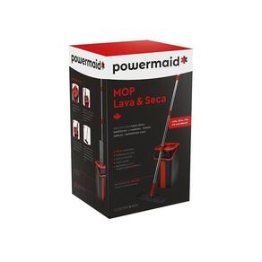 Mop lava e seca Tamanho: cabo em aço inox emborrachado com 125 cm de altura dividido em 3 partes balde de 22 cm x 18 cm x 37 cm, 1 refil de microfibra de 32,5 cm x 12,5 cm x 0,5 cm Composicão: Aço inox, PP, ABC e PVC Marca: Powermaid