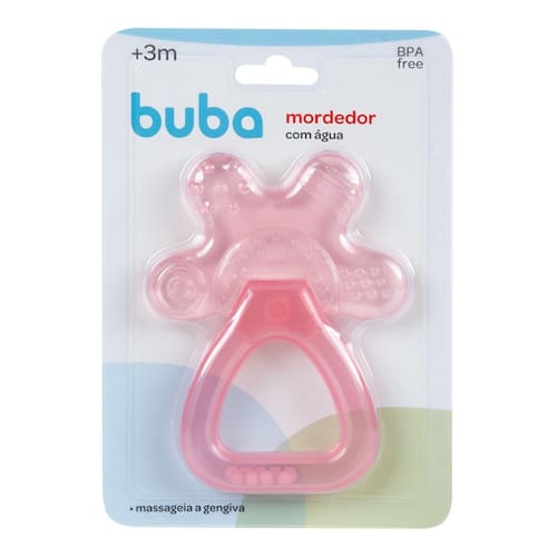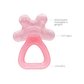 O mordedor é macio, leve, fácil de segurar, possui formato lúdico, chocalho suave, cores vivas e divertidas para entreter o bebê. Além disso, o mordedor também massageia a gengiva, diminuindo o desconforto do aparecimento dos primeiros dentinhos. O interior do mordedor contém água. Ao ser resfriado na geladeira, o mordedor gelado proporciona uma sensação de alívio e frescor para o pequeno.