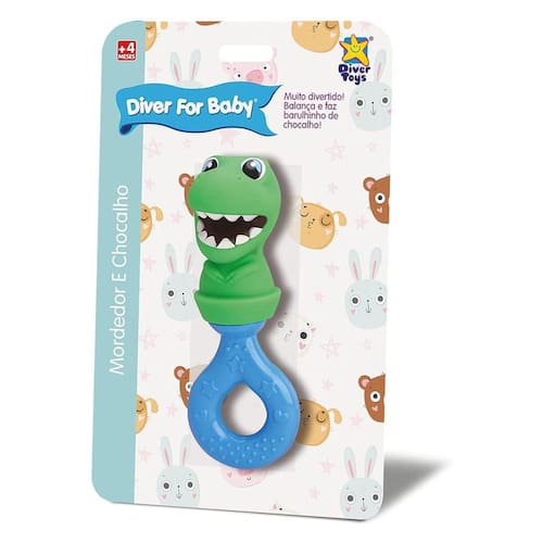 Mordedor Chocalho Dino Diver For Baby da Divertoys vai acompanhar o bebê em casa no passeio, onde quiser. Cores vibrantes, som e formas que estimulam o sentido do bebê. Barulhinho suave, material resistente e atóxico.