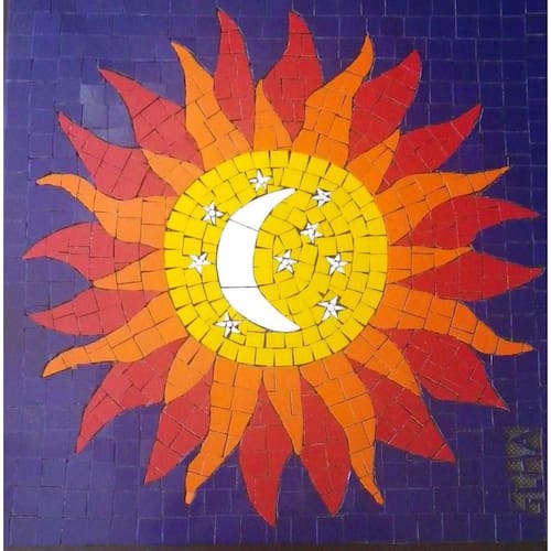 O mosaico exibe uma representação detalhada do sol, com seus raios irradiando para fora em um padrão cintilante. As cores vibrantes e a riqueza dos detalhes criam uma atmosfera de alegria e luminosidade, que é perfeita para áreas de lazer ao ar livre.