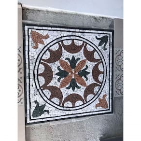 Especificações técnicas do mosaico: Feito com pedras - Mármores e granitos de todo o Brasil e importados da Europa e Ásia - para obter todas as cores desejadas em pedras naturais; Vem todo montado sobre tela, só colocar conforme manual de colocação, Resistência e Durabilidade em área interna e externa; Espessura de 10 mm Mesma espessura do porcelanato ou piso cerâmico Liso e agradável para uso diário; Mosaico feito integralmente à mão com técnica do mosaico romano;